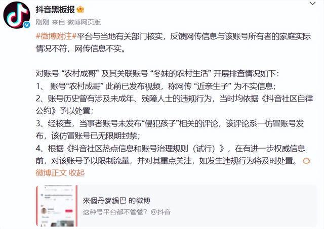8月21日,#Male名人与三名残疾妻子#结婚的话题成为微博的搜索。 21日下午,Douyin Blackboard报纸发布了答案。他们报告说,在相关的本地部门验证的平台以及在线分发的信息并不与帐户家族所有者的真实情况相吻合,并且在线分发的信息是不正确的。这是一项“国家中的Chenge”调查及其相关叙述“ Dongmei国家的生活”。 1。“国家的奇格”以前发布了一段视频,表明“亲戚和儿童”是虚假的信息。 2。帐户历史包括涉及未成年人和残疾人的违规行为,并根据当时的“ Tik Tok社区的自我差异条约”来解决。 3。确认后,帐户帐户尚未发布与“ Viochild的行为”有关的任何评论。这些评论由Forged AC发布无限期禁止计数和锻造帐户。 4。根据Tik Tok社区的信息和帐户规则,帐户将受到限制,并将集中在其他授权信息之前。如果有违规行为,它将及时对待。 Douyin Blackboard报纸发布了一条消息,以回应互联网用户的评论来源:Sanxiang Metropolis Daily,Douyin Blackboard Newspect B48
